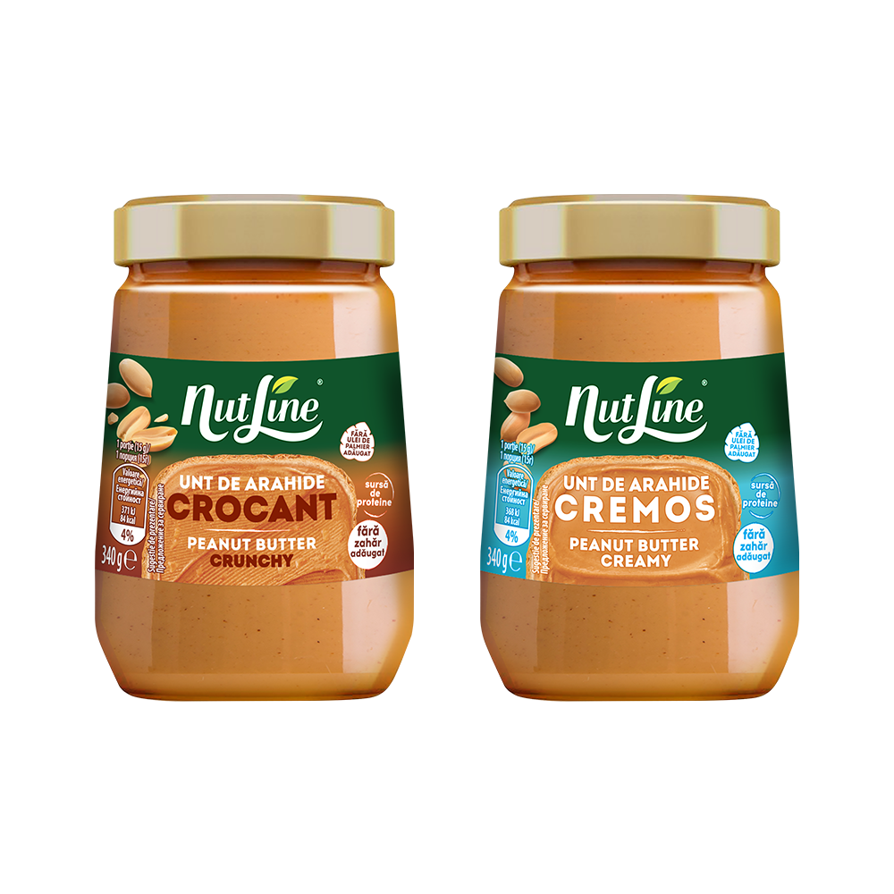 Dragoste de la prima linguriță! Untul de arahide de la Nutline defilează în două versiuni: fie cremos ca textură și gust, fie cu bucăți de arahide care să creeze o experiență intensă de gust de alune bine crescute și bine prăjite. Care îți va aluneca pe pâine?